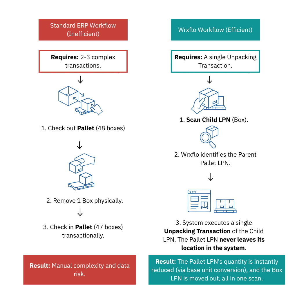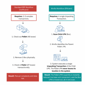 Many warehouse management and ERP systems struggle when inventory drops below the pallet level. Our recent conversations with clients consistently highlight one major pain point: the moment a single Box needs to be removed from a Pallet, the system forces a complicated, multi-step transaction.